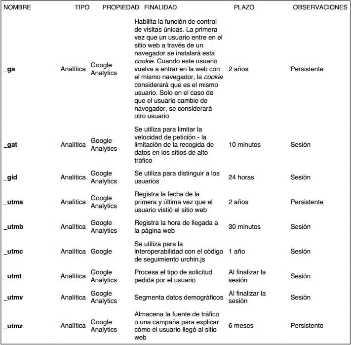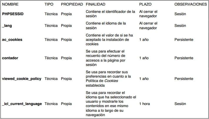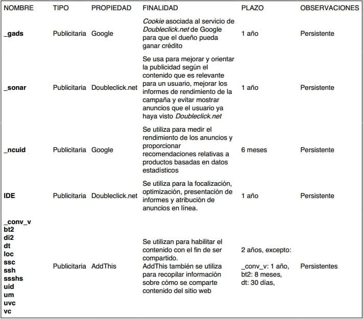 COOKIES QUE SE UTILIZAN EN ESTE SITIO WEB
